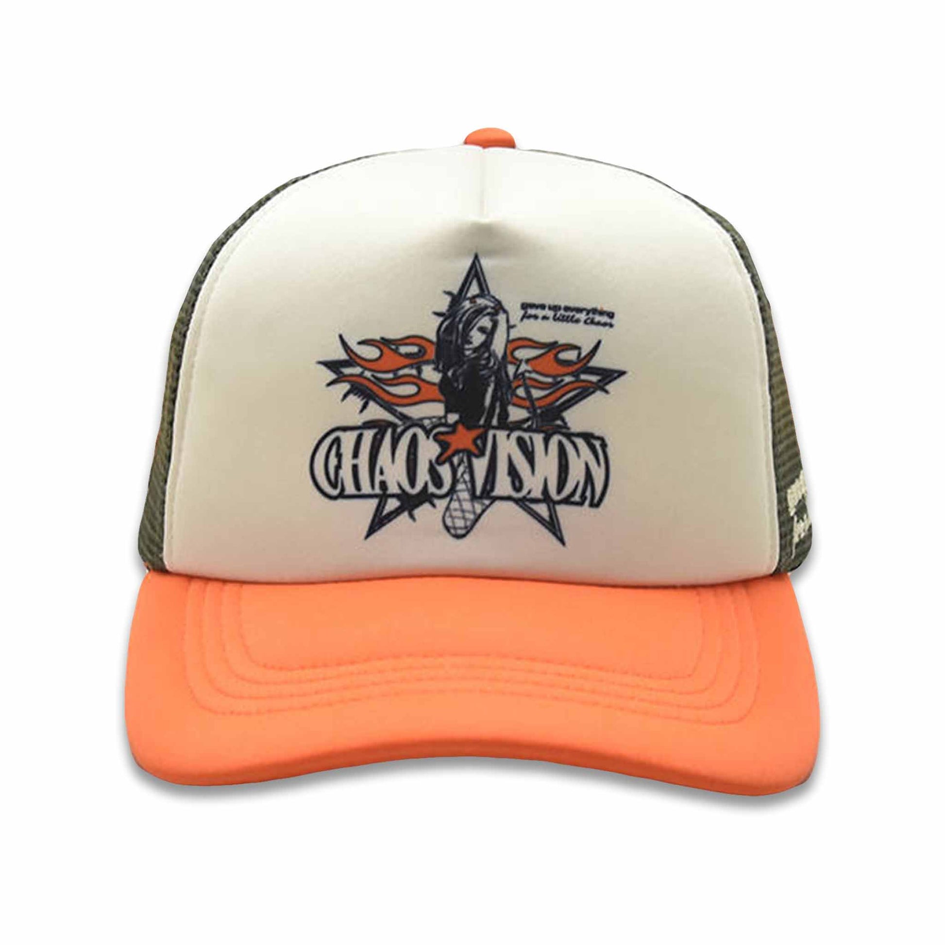 Embrace the Chaos with this custom, cut & sew trucker hat.
